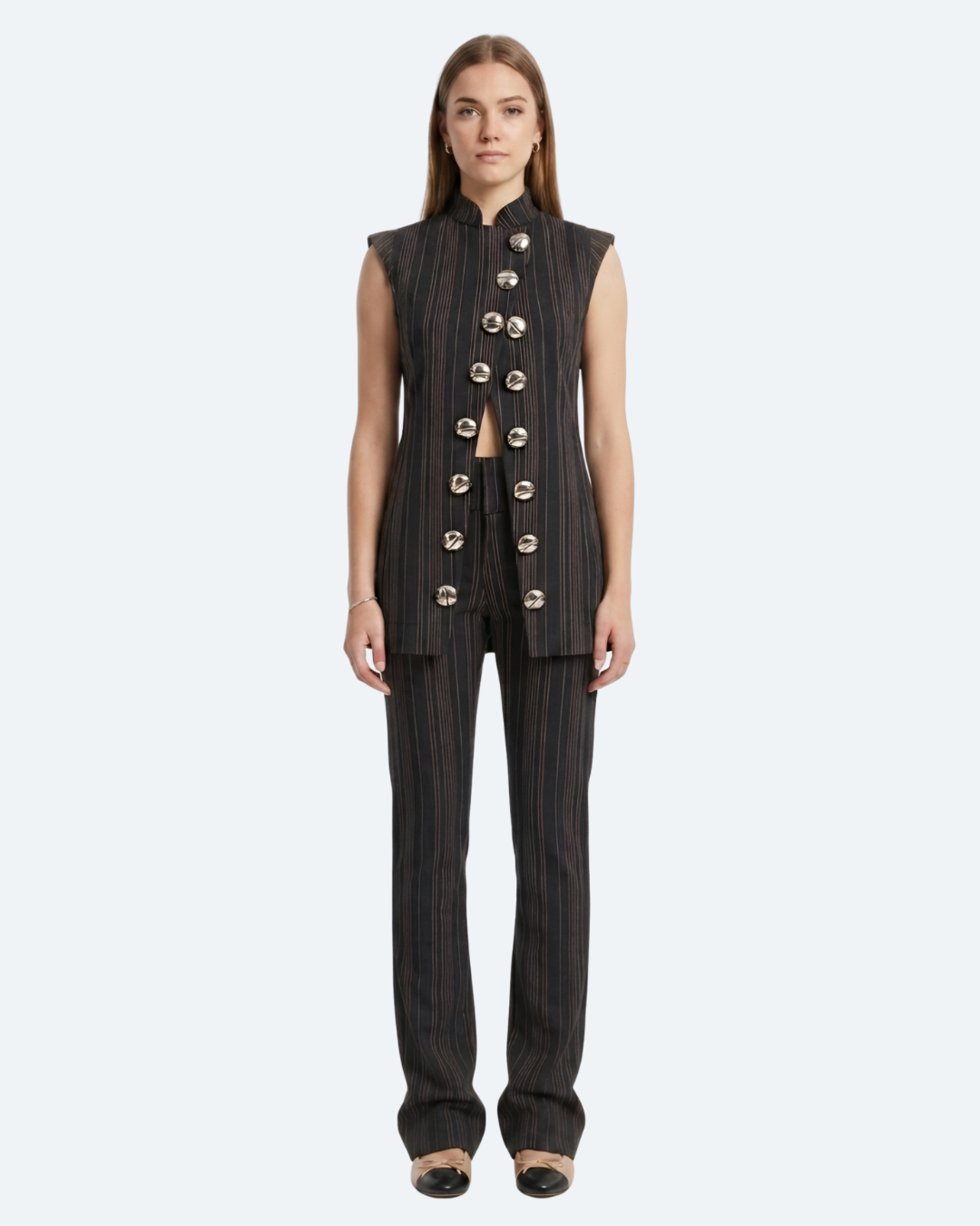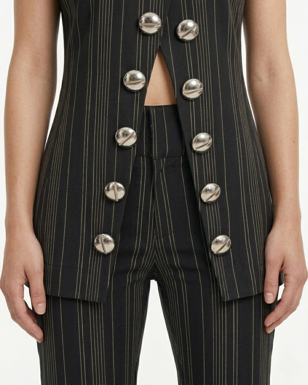 Design Details: Signature sculptural hardware, vertical linear precision, and sleeveless vest tailoring.