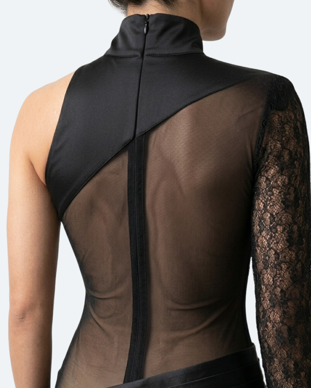The Shadow Drape dress is a masterclass in asymmetric design and refined textures. Crafted for a high-end aesthetic, this piece features a single long sleeve in intricate floral lace, a sophisticated mock neckline, and a dramatic tulle drape that adds fluid motion to the silhouette. The base is engineered for a precision fit, ensuring both comfort and a clean, sculptural look.